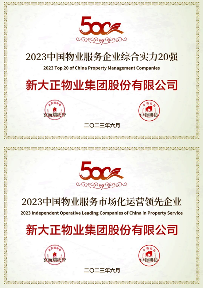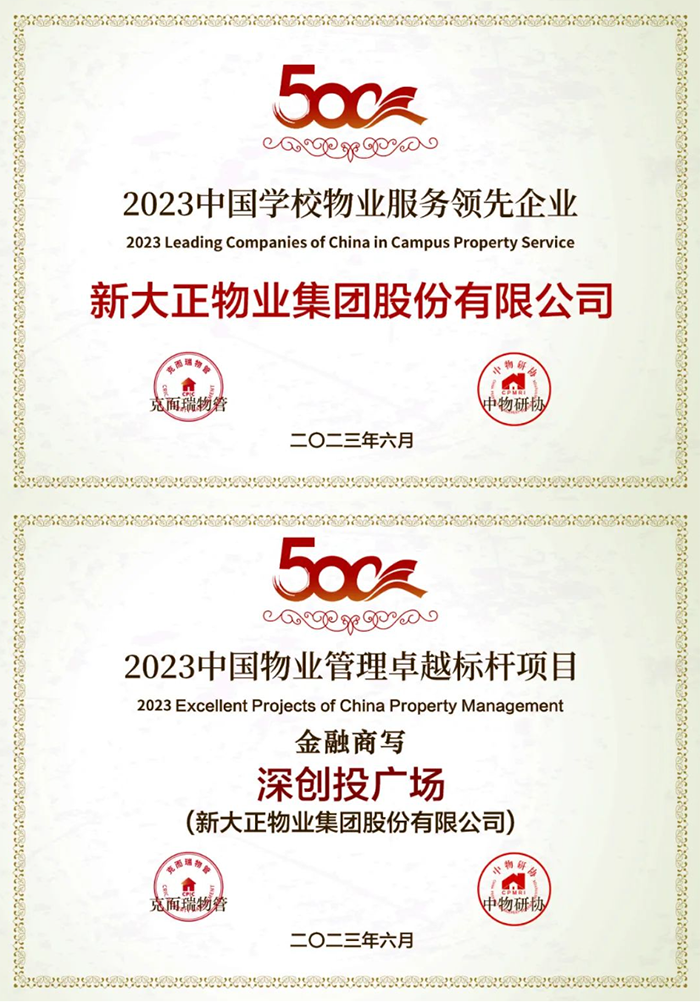 银娱优越会荣获“2023中国物业服务企业综合实力20强”、“2023中国物业服务市场化运营领先企业”、“2023中国学校物业服务领先企业”多项殊荣,服务项目深创投广场获“2023中国物业管理卓越标杆项目”称号。