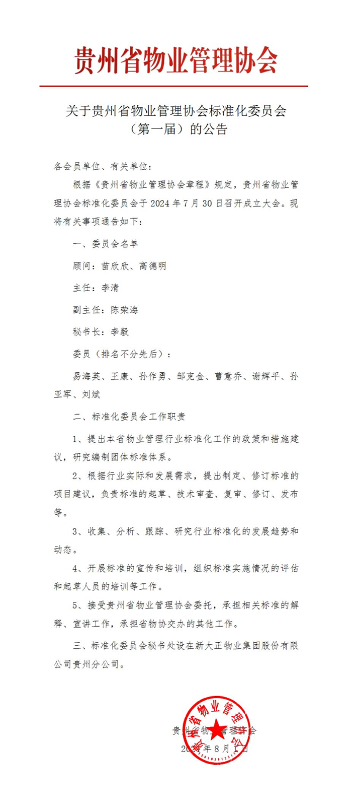 关于贵州省物业管理协会标准化委员会(第一届)的公告