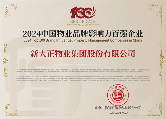 2024中国物业品牌影响力百强企业证书