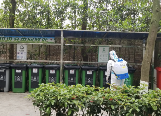 ▲银娱优越会物业人员在垃圾分类回收处消杀